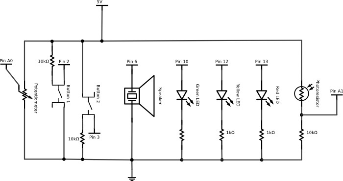 /* Traffic Lights * Solution by: * * This is a simple traffic light simulator. * * During the day, when the walk button (the bottom one) is pressed, the light turns * green so you can walk. Then it cycles back to red. * * At night, when there is little traffic, the button does nothing and the light * blinks red to act as a simple stop signal. * * The potentiometer controls the speed at which the light cycles. * */ // Symbolic names for our pins. const int pot_sense = A0; const int light_sense = A1; const int walkButton = 2; const int button2 = 3; const int red = 13; const int yellow = 12; const int green = 10; // variable for light speed int light_spd = 500; void setup() { // Configure inputs pinMode(pot_sense, INPUT); pinMode(light_sense, INPUT); pinMode(walkButton, INPUT); pinMode(button2, INPUT); // Configure outputs pinMode(red, OUTPUT); pinMode(yellow, OUTPUT); pinMode(green, OUTPUT); // Setting up Serial communication, just in case. Serial.begin(9600); } void loop() { //Get the speed the light will cycle at //if it is night { //the traffic light blinks red } //otherwise it must be day { //So the traffic light will show solid red by default //if the "walk" button is pressed { //Show green for a bit //Show yellow for a bit //Show red for a bit } } }