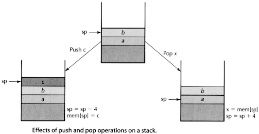 Some hardware has built-in push and pop operations. MIPS does not have them. Instead we directly manipulate the stack pointer and access the memory next to it.